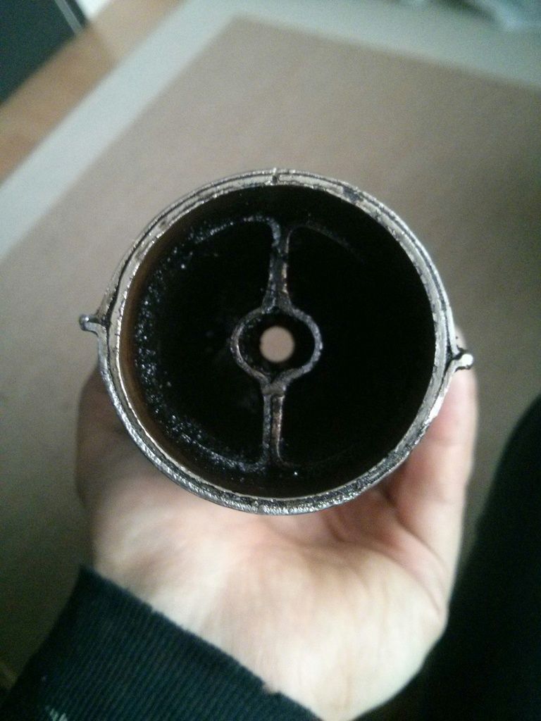 Otin nyt ensimmäisenä tuon pakoputken tarkkailuun, ja kyllä tässä putken päässä jotain hämärää tuntuu olevan. Mistä sen pakokaasun pitäisi oikein virrata? Itse en tuosta löydä kuin kuvissa keskellä näkyvän reiän, jonkä läpi tulee kierretanko, kun putki on kasassa, minkä jälkeen putki onkin käytännössä tukossa. Reikä on putken sisällä olevan "kupin" pohjassa. Tuo kuppi tuntuisi olevan ihan yhtenäistä metallia, kun ruuvimeisselillä ja paineilmalla sitä tutkiskelin.