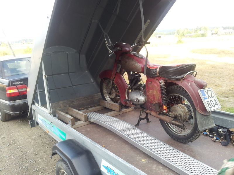 Aarre numero yksi, joka nyt ainakin piti joka kerta käydä tarkistamassa löytyi entisestä savusaunasta, silloisesta romuvarastosta. Siellä lojui tummanpunainen, ruostunut ja muutenkin ajanpatinoima moottoripyörän raato osittain purettuna nurkassa, sen näköisenä kuin olisi jäänyt remontti kesken joskus vuosia aikaisemmin. 175-kuutioinen Jawa 50-luvun lopulta.