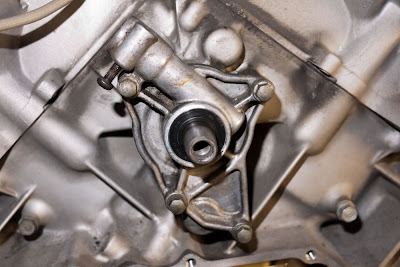 Nokka-akseli edestäpäin kuvattuna. Noin klo 11 kohdalla näkyy kohta johon kierroslukumittarin vaijeri tulee kiinni. Tuo avattu ruuvi toimii lukitsimena, että vaijeri pysyy paikallaan.