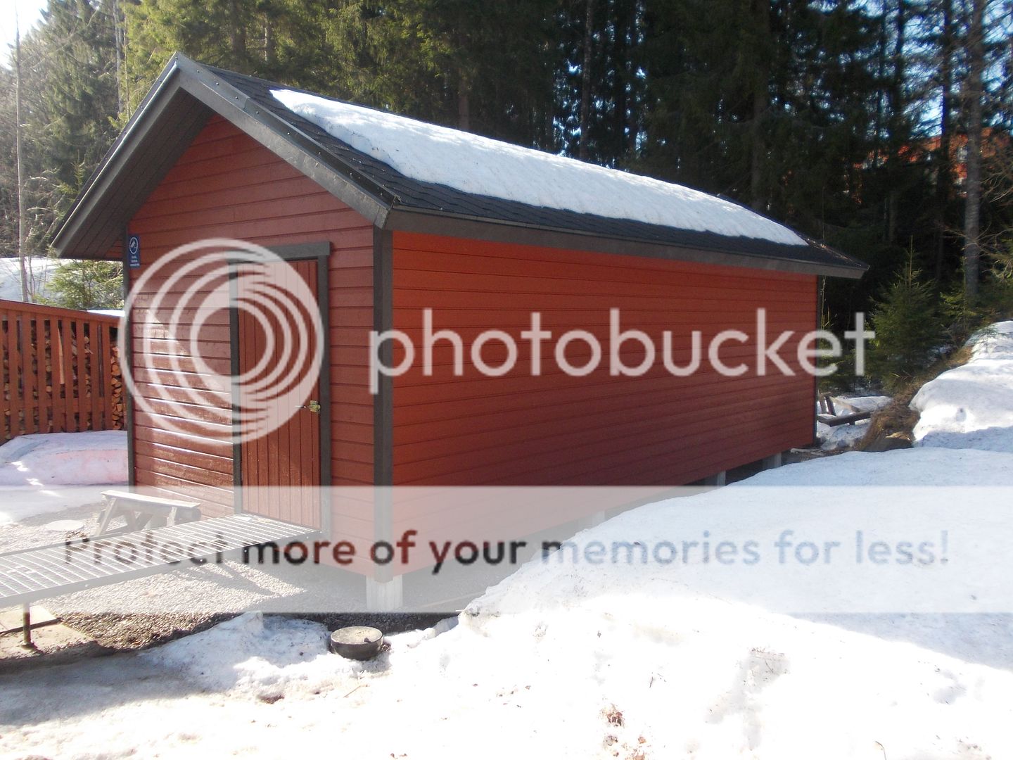 Puuvaraston katolta oli lumi kadonnut jonnekkin, joten lunta ei ole enää kuin maassa.
