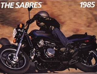 Sitten oli naita hajamalleja mita tuotiin. Yksi Jenkkimallinen V65 Sabre tuotiin kun sai pirun halvalla mutta siihenhän tuli homeveroa (ylivuotisista pyorista kannettiin 20% verokorotus mutta siita lisaa myöhemmin) joten se halpa hinta hieman tuhoutui. Tama musta kardaanivetoinen pyora oli ihan toimiva peli mutta sita vaivasi Suomessa myydyn VF750S:n surkea maine koska ne olivat ihan samannakoisia. Siina oli se hyvä puoli etta aina kun me myytiin se niin asiakas ei voinut kayda muualla sita vaihtamassa, kun kaikki kauppiaat pelkasivat sita. Siina meillakin oli pieni oma monopooli… Meille se kelpasi ja me myytiin samaa pyoraa aina vuoden valein ja joka kerta saatiin pienen ”siivun” Tassa se pyoran myynti esite, pyorassa oli tehoa riittavasti ja kuutioita 65 kuutio inchea eli 1100 kuutionen. Toisin kun hanen pikkuveljensa VF750 S tassa mallissa ei ollut mitaan lastentauteja.