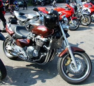 Sitten Tassa tulee se HONDA X4 joka oli tosi hyvannakoinen peli. Me tuotiin niita kai 5-10 kpl mutta se kai loppui siihen kun runkonumerot pitivat olla 17 numeroisina. Pyorat olivat kuristettuja 100 hevosvoimiin, Japanin malleja ja Dieter Konemannilta saatiin ohjeet miten ohittaa se kuristus.