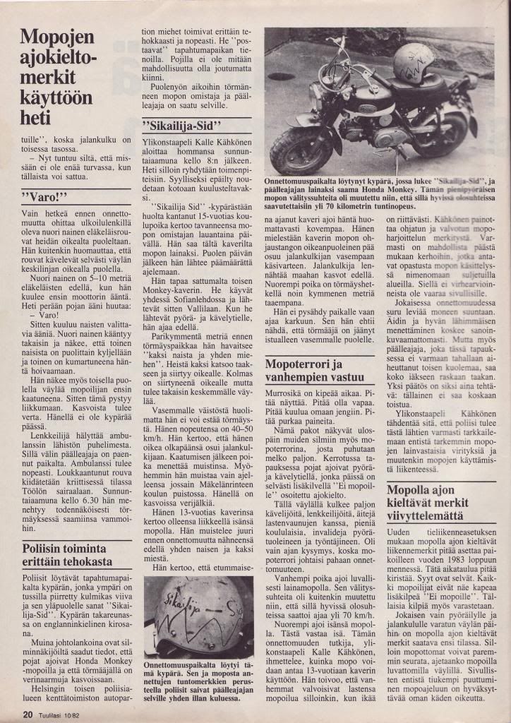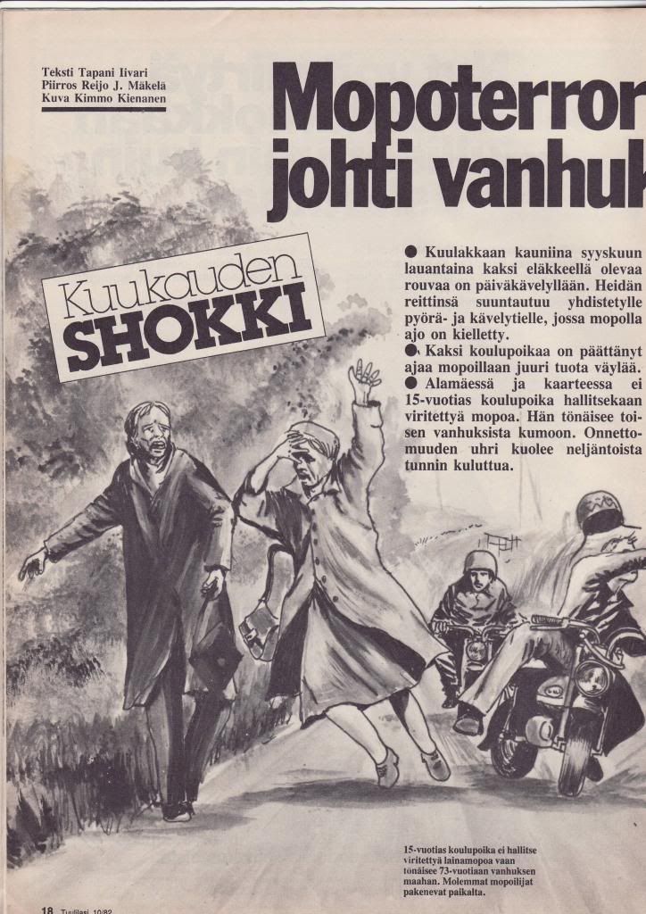Olisko tuo tappajamopo juttu ollu jossain 81 tai 82? Tm.ssä. joskus aikaa kirjastosta näitä vanhoja teeämmiä olen lainaillut. Saa koko vuosikerran. Muutenkin varsinki 80luvun teeämmis mielenkiintoisia liikenneonnettomuus juttuja. Aika paljonkin mopoihin  liittyviä tapauksia. Eikös tuossa tappajamopojutussa ollu kuvakin kyseisestä jäykkäperä mankista ja 'sikailija-sid'? Kypärästä