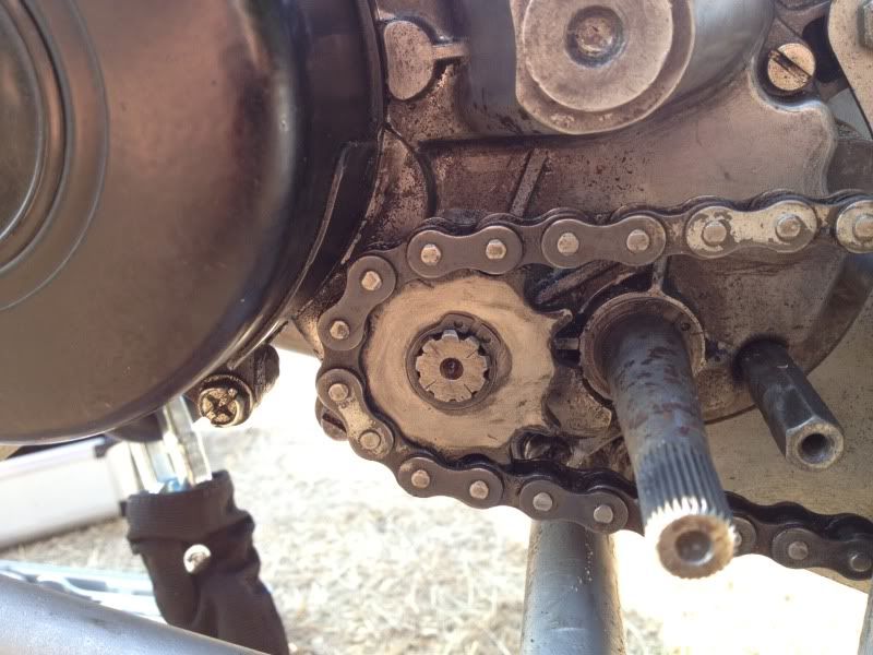 Vaihtoehtoisesti toisiorattaan mutteri irti. Eli iso rautainen hammaspyörä ja sitä pitävä mutteri, siinä pitää olla korvallinen pläkkiprikka joka väännetään asentaessa mutterinkylkeen kiinni ettei lähde lentoon vaikka löystyisikin.